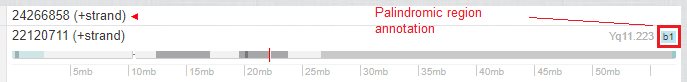 The new screen has a red arrow pointing to the hg19 position number. This tells us that we are looking at information that was submitted under the former hg19 (Build 37) version. The black cursor is pointing to this SNP's region in the Y chromosome. The bar beneath it shows the exact position.